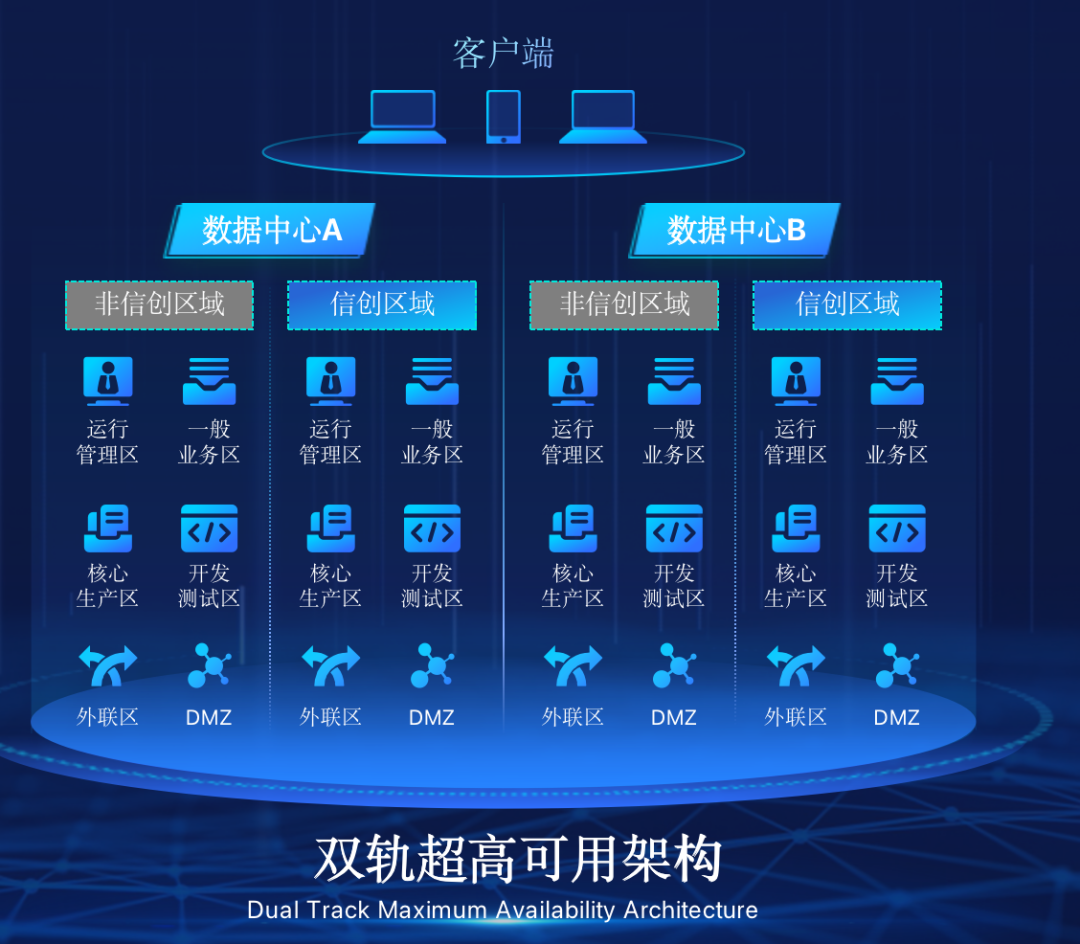 William希尔体育在企业面临自主创新IT基础重构过程中,推出的全新架构双轨超高可用架构(简称DTMAA),在双活数据中心的分区调度基础上,添加每个数据中心内信创域和非信创域的分域调度,来实现分区分域协同的多活双轨超高可用。